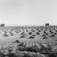 - "Third Cutting of Alfalfa. C.E. McClain, Twin Falls, Idaho;" field with small piles of alfalfa. Two large stacks of hay/alfalfa in the background.