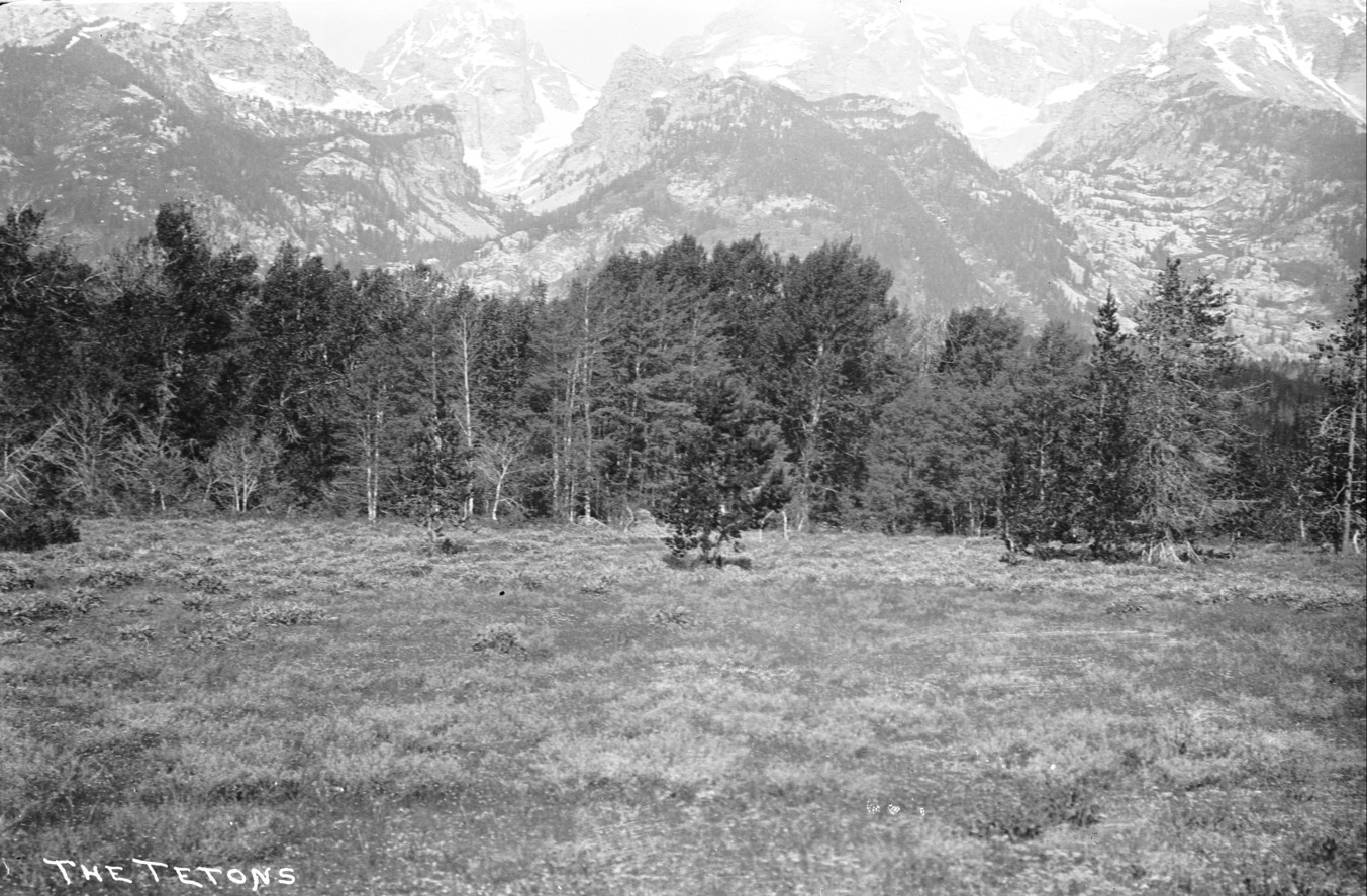 - "The Tetons;" treeline in front of mountains