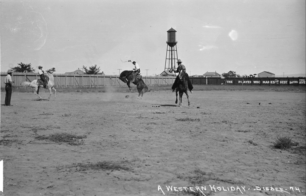 - "A Western Holiday;" cowboys exhibiting horses at the Twin Falls Athletic Field. Three men are on horses, while another stands to the side.