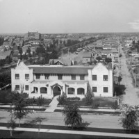 - Wide aerial view of west Twin Falls with the Justamere Inn in the foreground and Lincoln School in the background, residential house and buildings in between. A woman walks across the lawn in front of the building. Taken from atop the Twin Falls County Court House.