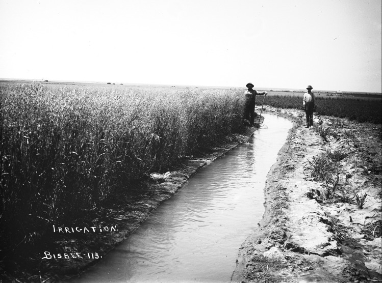 - "Irrigation;" two men stand beside a canal ditch.