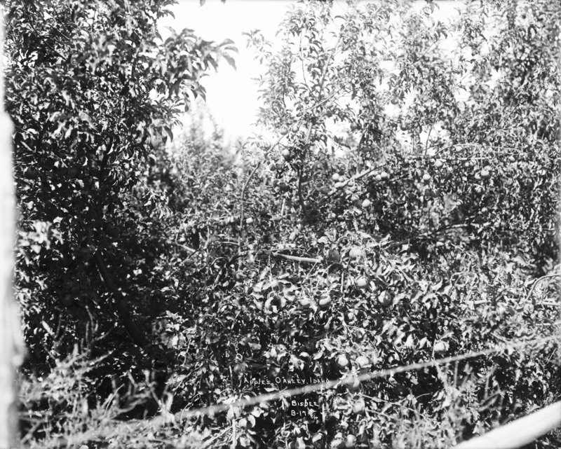 - "Apples. Oakley, Idaho;" closeup of branches on an apple tree