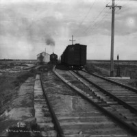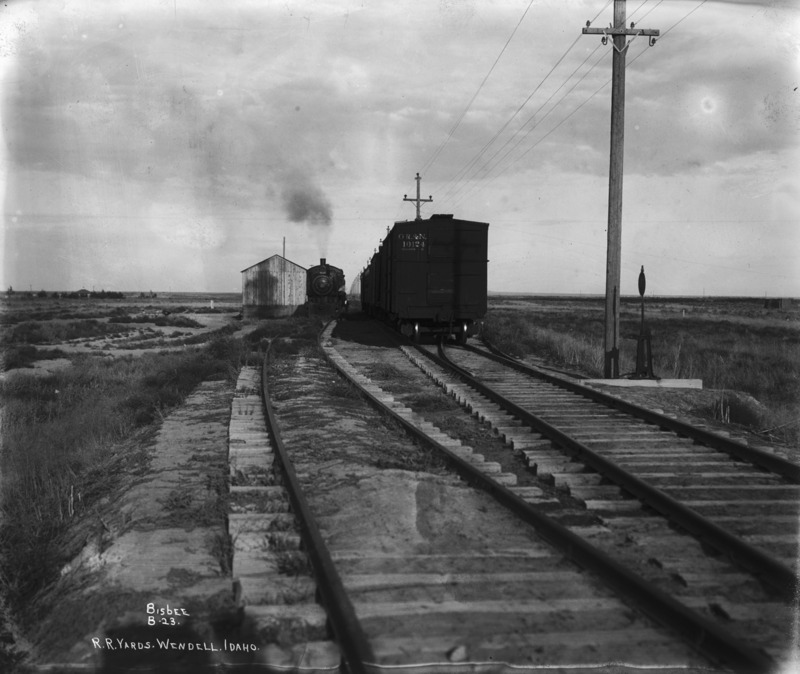 R. R. Yards. Wendell, Idaho;" two trains pass on the railroad tracks beside a small station (depot)