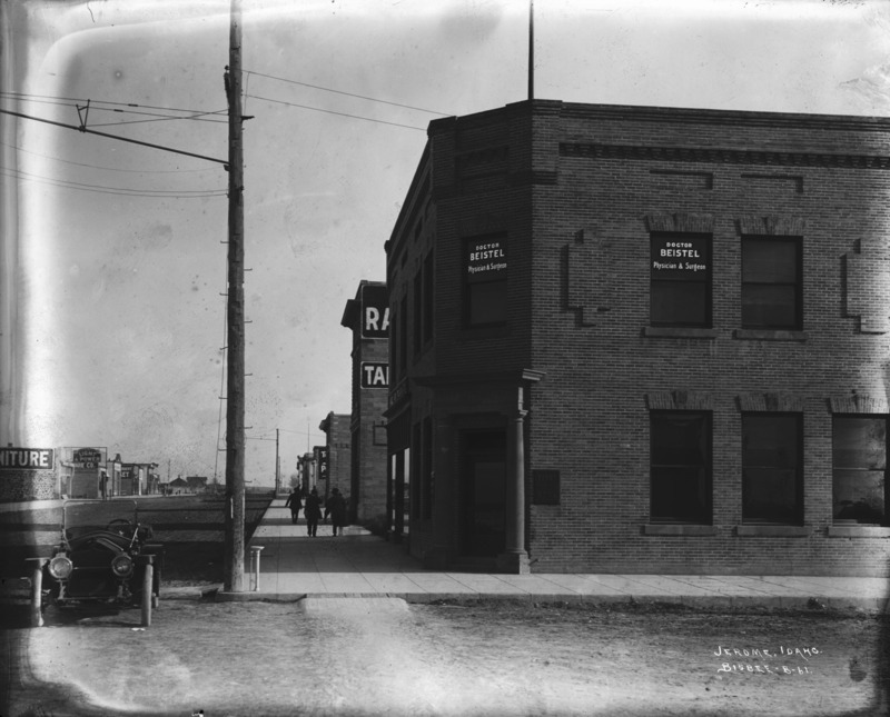 - "Jerome, Idaho;" looking down a street in Jerome; visible are the First National Bank with the office of Dr. Beistel, physicial and surgeon; a furniture store; Light and Power. Several people walk along wooden sidewalks