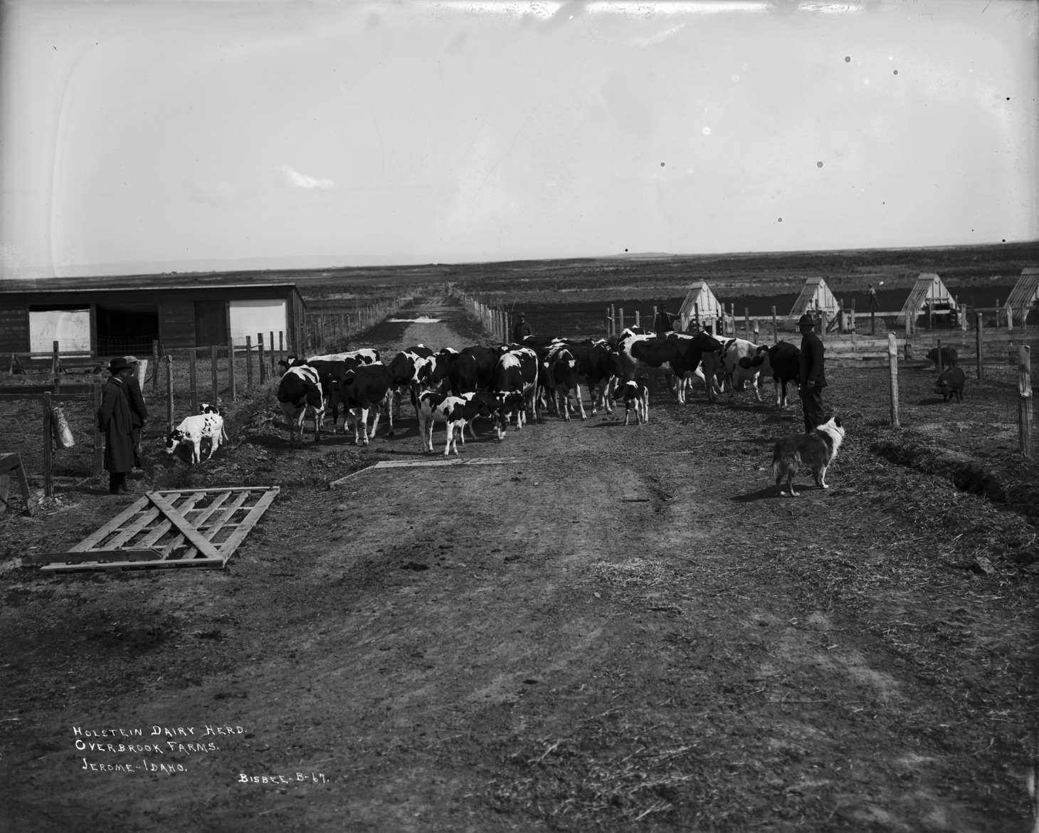 - "Holstein Dairy Herd; Overbrook Farms; Jerome, Idaho;" several men, and a dog, stand alongside a herd of cows as they direct them down a fenced lane into a pasture.