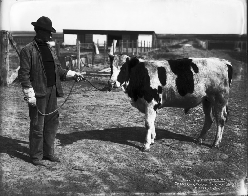 - "Year Old Holstein Bull; Overbrook Farms, Jerome, Idaho;" a man stands holding a rope tied to the nose ring of a cow.