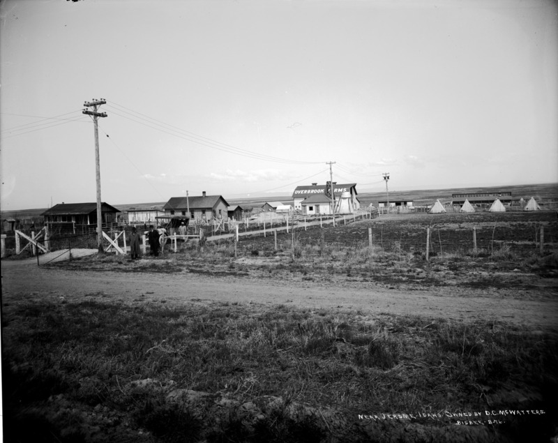 - "Near Jerome, Idaho; Owned by D. C. McWatters;" three men stand in a fenced lane on a farmstead; a house, barn, and numerous other outbuildings are visible. A sign on the barn reads, :Overbrook Farms."