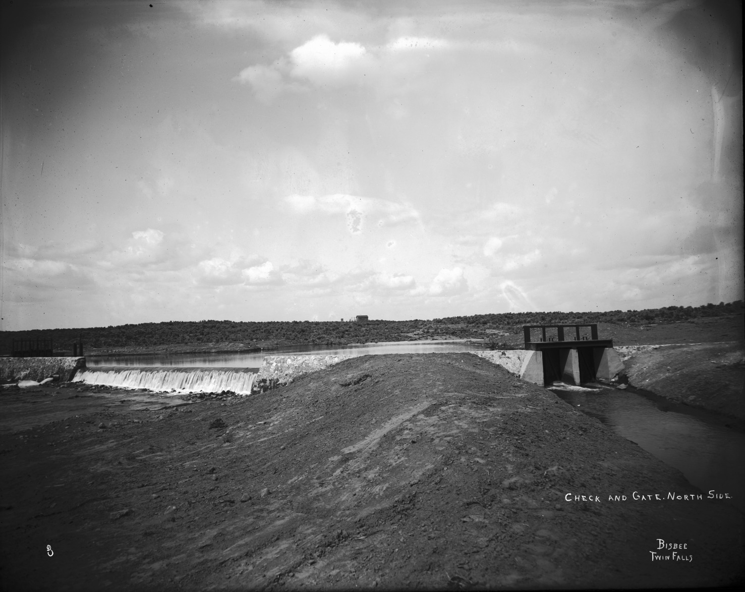 - "Check and Gate, North Side;" wide view of gate; small building in background