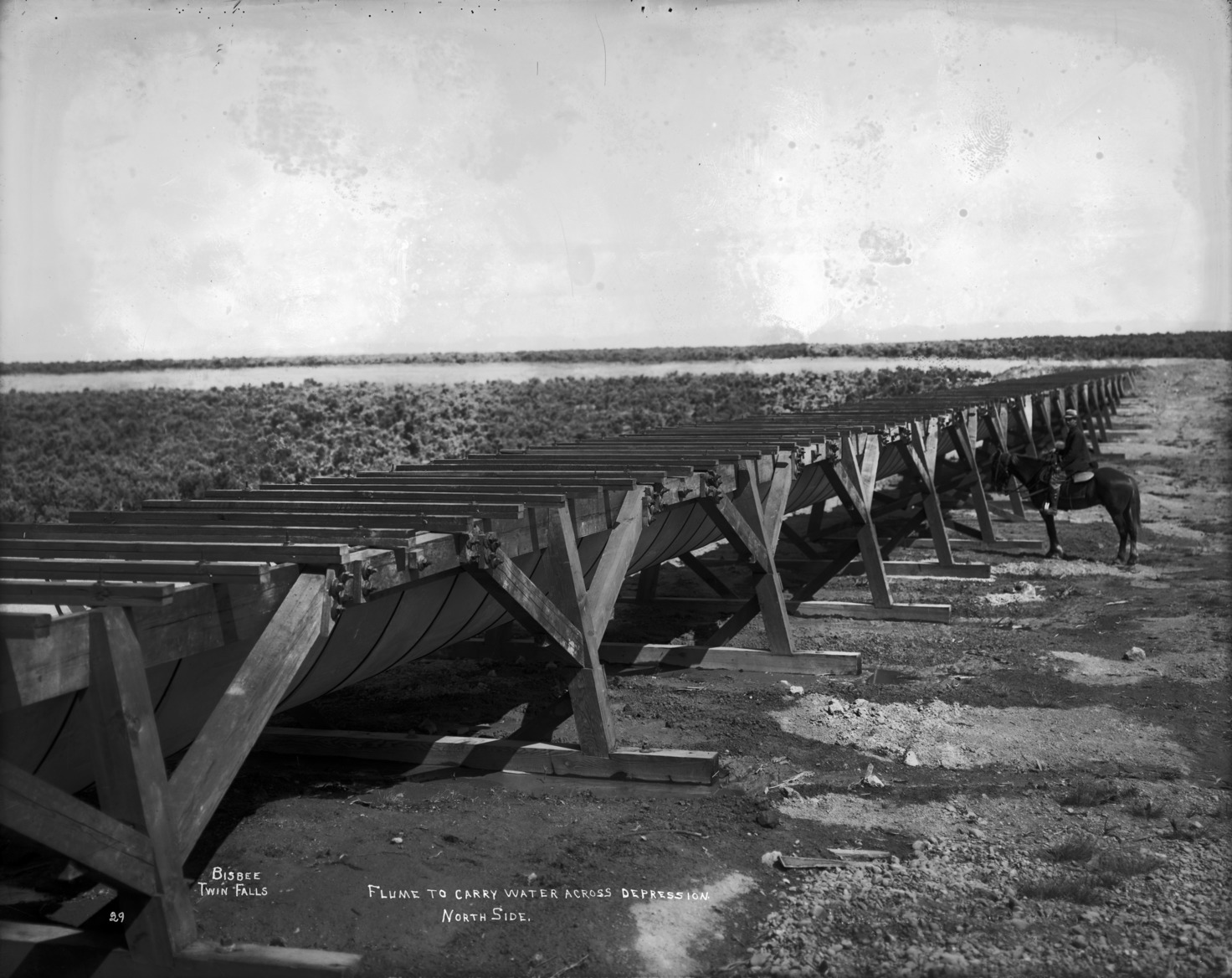 - "Flume to Carry Water Across Depression, North Side;" a man on a horse stands at the side of the flume