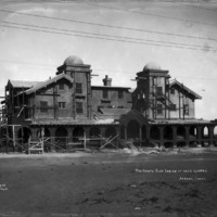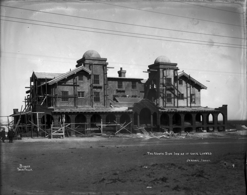 - "The North Side Inn As It Once Looked; Jerome, Idaho;" view of construction on the Inn, three men stand on the very left