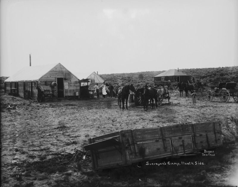 - "Surveyor's Camp, North Side; men, teams of horses, and buggies stand in front of a couple of wood frame buildings and a tent among the sage brush. A wagon box without the wheels is visible in the foreground.