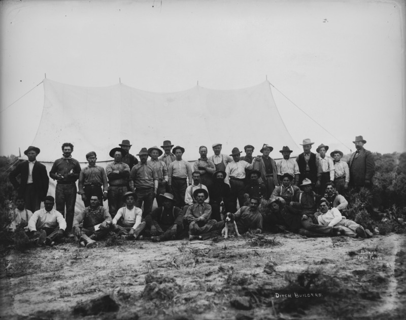 - "Ditch Builders;" dozens of men pose in front of a tent during the North Side canal project. A dog stands in front.
