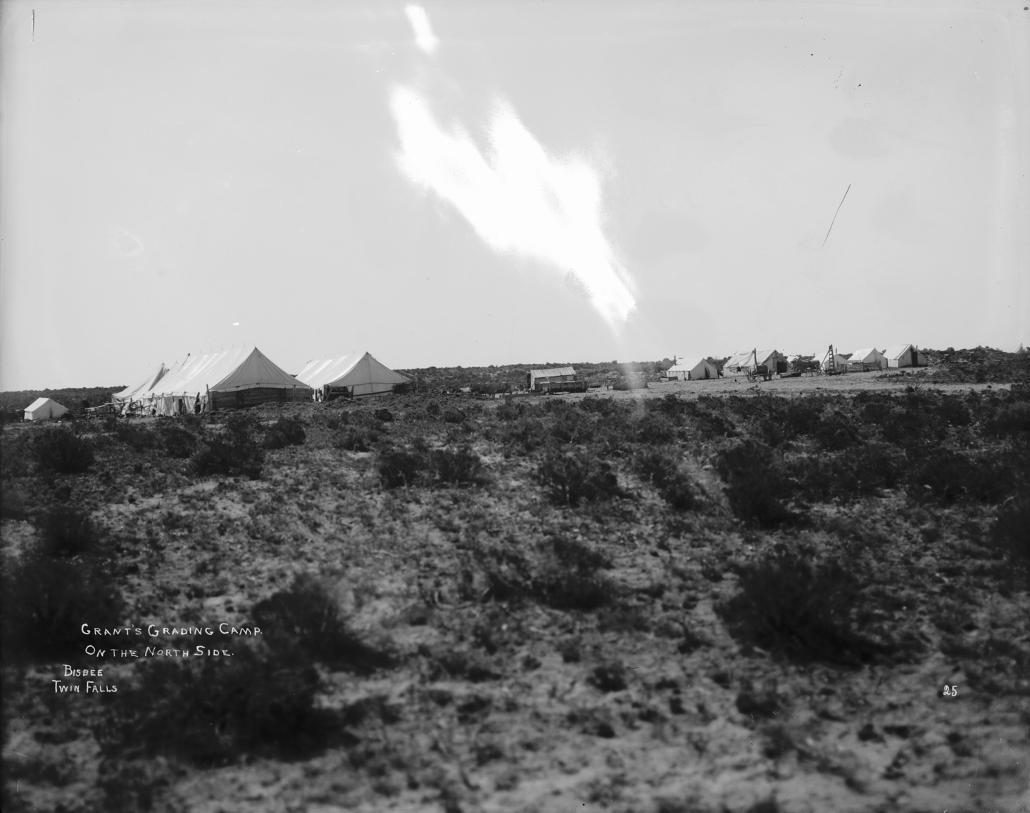 - "Grant's Grading Camp on the North Side;" several large canvas tents, a wood frame building, and machinery among the sage brush