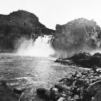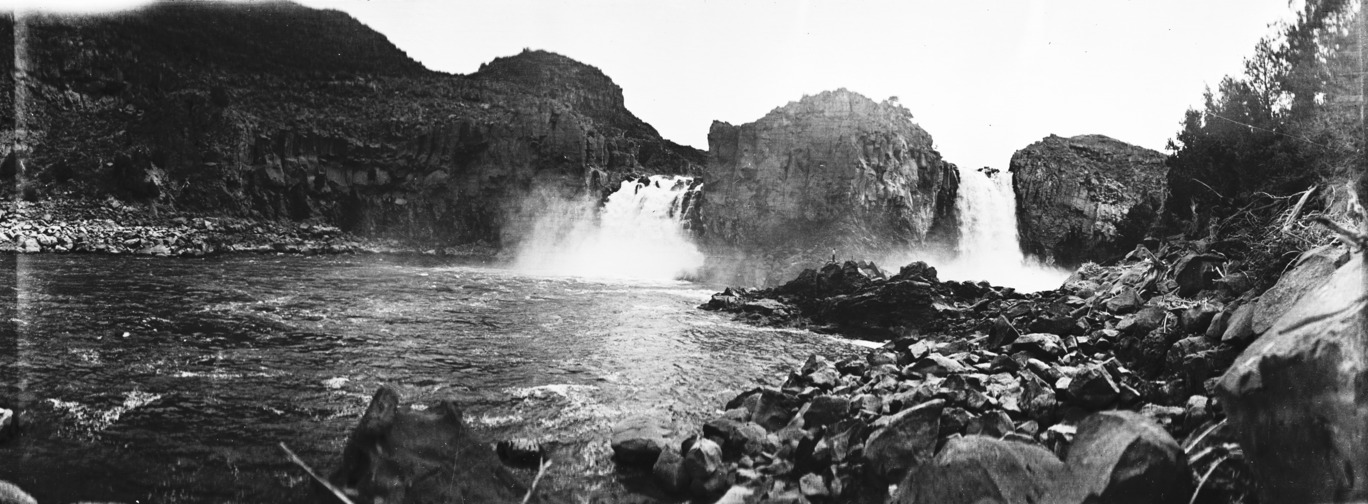 Wide view of the Twin Falls from the Snake River. Only two channels are visible.