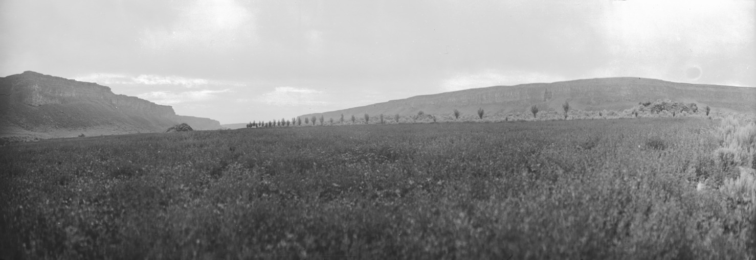 - Panoramic view of a field and row of trees at the bottom of canyon.