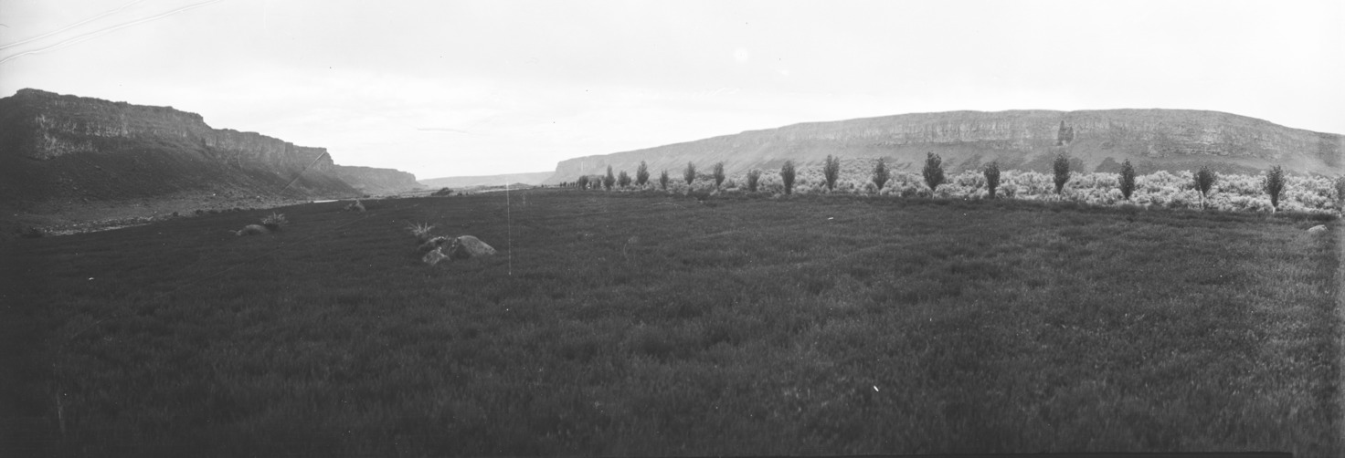 - Panoramic view of fields and trees at the bottom of the canyon.