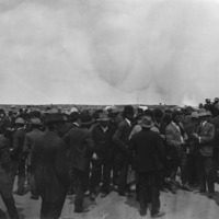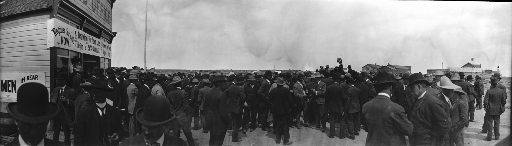 - Panoramic view of a drawing for town lot, with a large crowd of in front of a land office building.