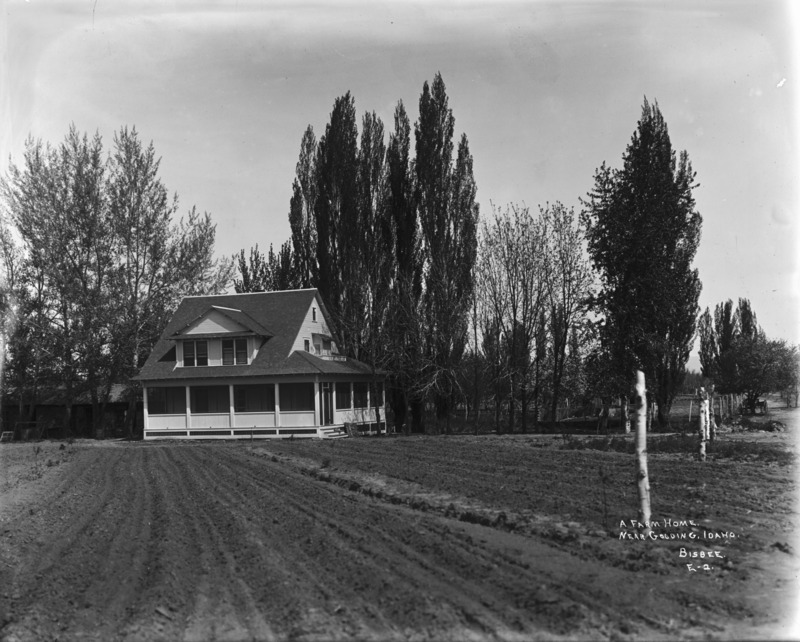 - "A Farm Home, Near Gooding, Idaho;" a white house sits among several trees, with a plowed field in the foreground. A fence lines the property on right.