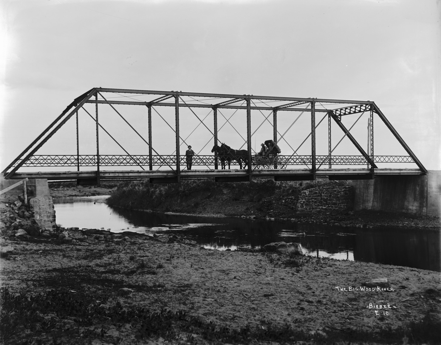 - "The Big Wood River;" a bridge over the Big Wood River; one man stands on the bridge, while two men sit in a buggy driven by a team of horses.
