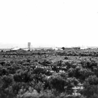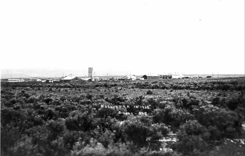 - "Hollister in 1912;" wide view of early Hollister across a sage brush plain, showing several buildings.