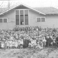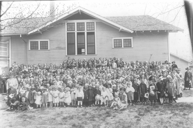 - Group of people, children and adults, posed outside the First Christian Church. {Other denominations that used the building included the Immanuel Lutheran Church, Grace Baptist Church, Gospel Temple Church, and Reformed Church,}
