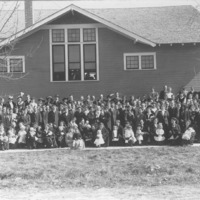 - Group of people, children and adults, posed outside the First Christian Church. {Other denominations that used the building included the Immanuel Lutheran Church, Grace Baptist Church, Gospel Temple Church, and Reformed Church,}