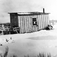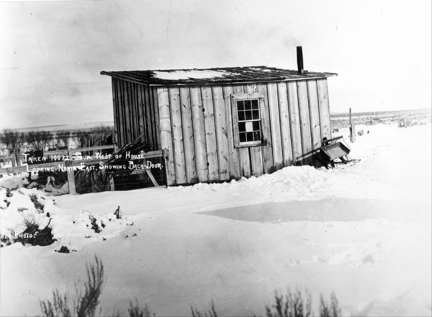 - "Taken 100 Ft South West of House, Looking North East, Showing Back Door;" an outbuilding in snow.