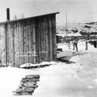 - "Taken 50 Ft South East of South East Corner of House;" an outbuilding in the snow; fencing or corrals are visible in background.