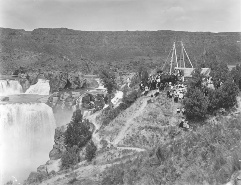 - Group of people posing near Ezra Meeker, his wagon and oxen on the right at the top of a rise by the Shoshone Falls on Flag Day, June 17th, 1910.