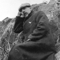 - Clarence E. Bisbee, in an overcoat, posing for a photo; rock canyon wall behind him.