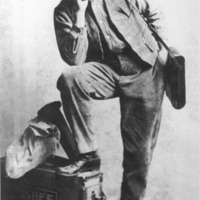 - Clarence Bisbee posing with some of his photographic equipment, his foot resting on his glass plate negative box. {Copy possibly taken from a printed original.}