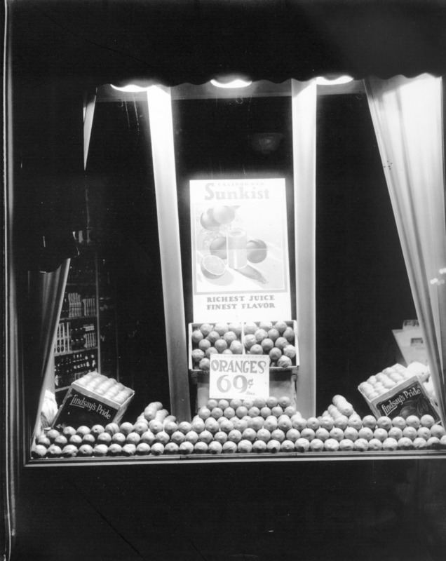 - Display in a store window advertising Sunkist Oranges.