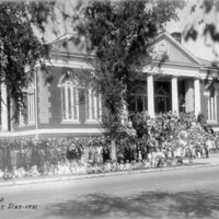 - "Rally Day - 1931;" large group of people pose on the Shoshone St facing steps of the First Christian Church.