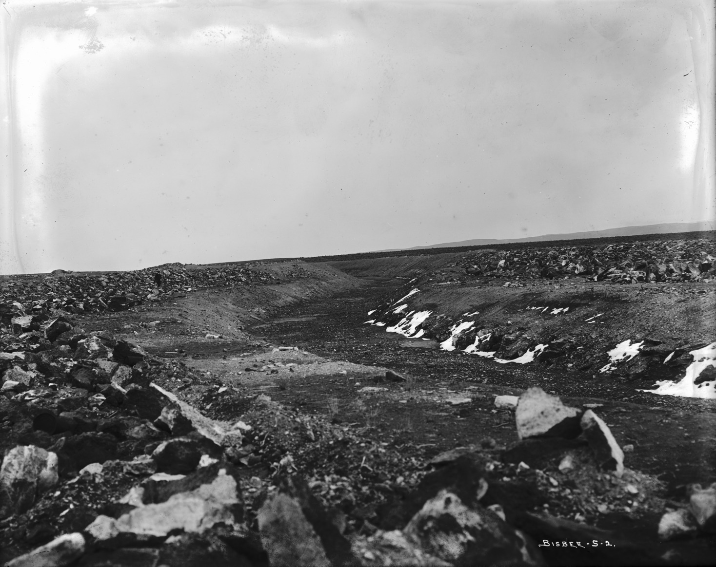 - Wide view of a dry canal bed. Rock fill lines the edges.