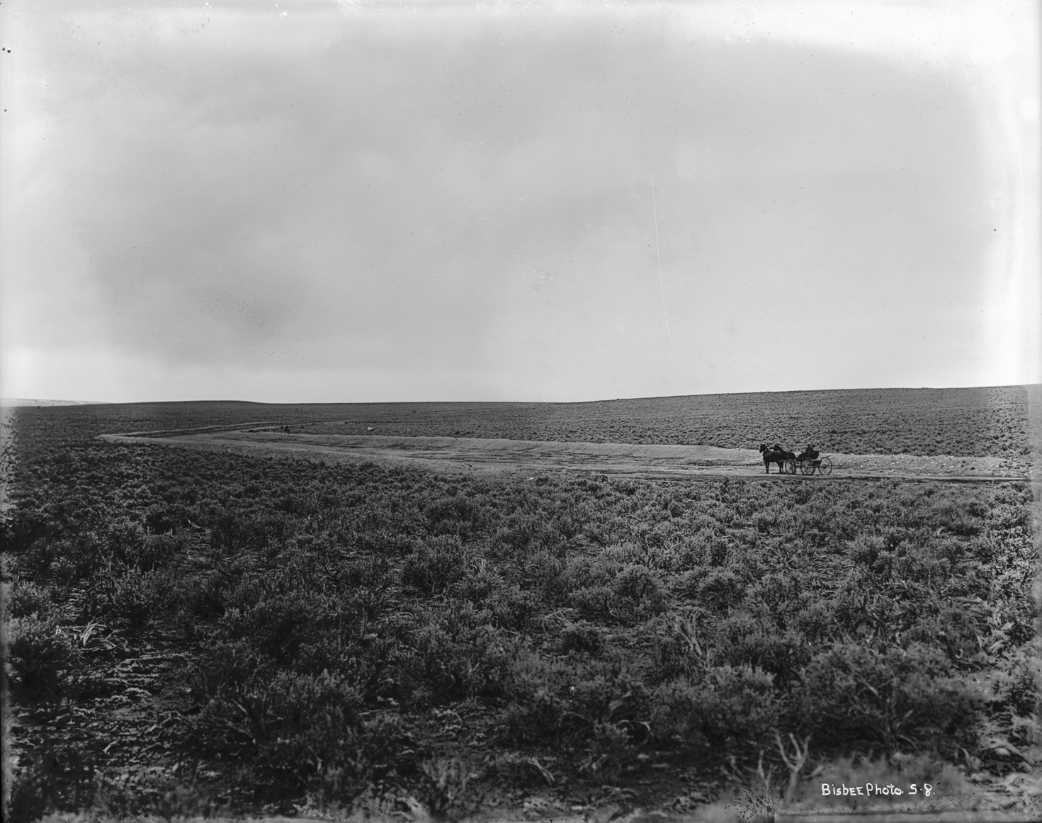- A two-horse buggy is driven along the edge of a flat, dry canal amidst the sage brush.