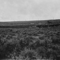 - A two-horse buggy stands on a low bridge above a dry streambed or canal amidst the sage brush. A man stands beneath the bridge.