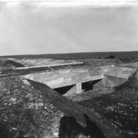 - A canal siphon under a railroad track. A man stands underneath; two horses and a buggy are visible behind the berm.