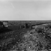 - A man (possibly Clarence Bisbee) stands beneath canal gates under construction.