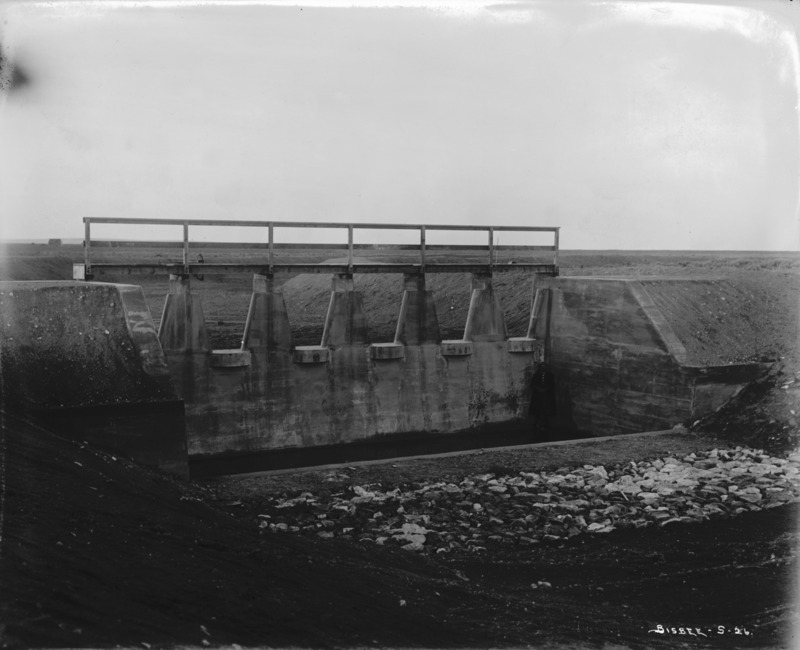 - A large concrete dam in a canal system.
