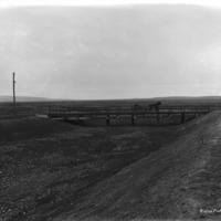 - A man and a two-horse buggy stands on a low bridge over a dry canal.