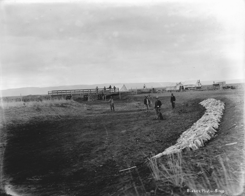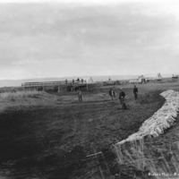 - Several men stand in a shallow canal. Other men stand on a low bridge in the center background. Tents and outbuildings in a camp nearby.