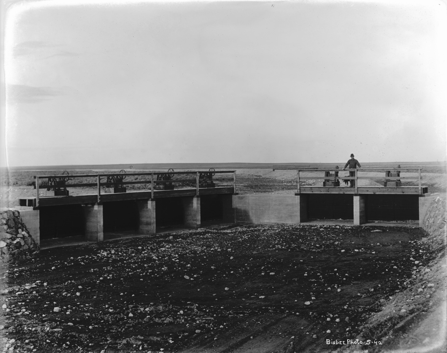 - A man stands atop canal gates over a dry canal bed.