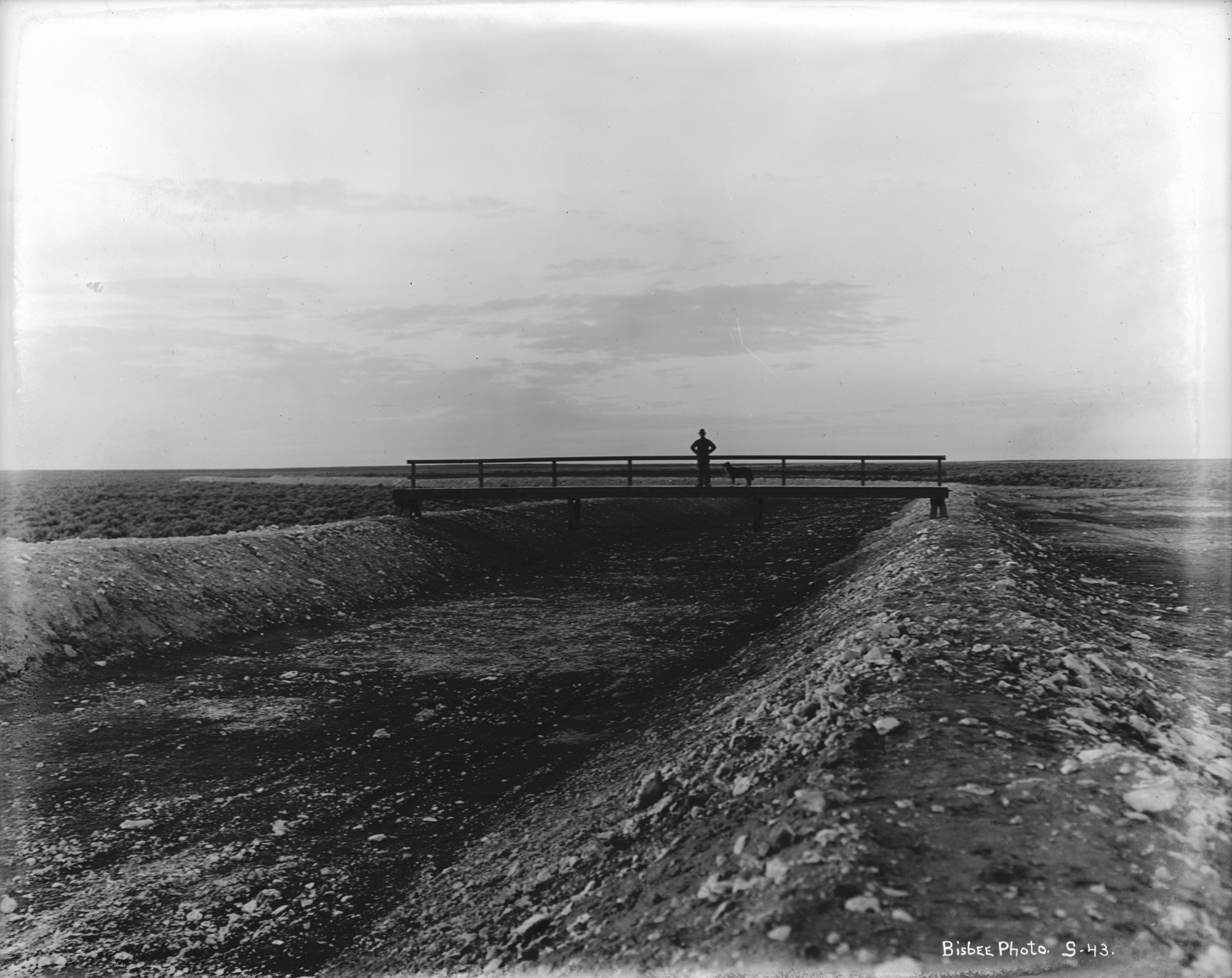 - A man and a dog stand on a low bridge over a dry canal bed.