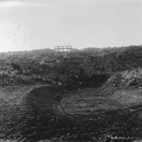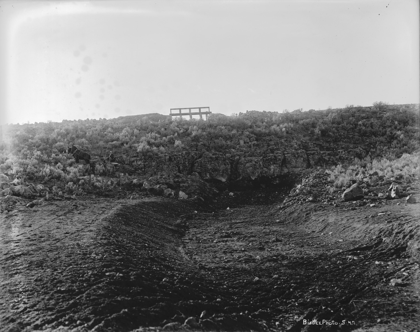 - A dry canal bed at the base of a sage brush covered rock embankment. Gates at top of embankment. A man driving a two-horse buggy is stopped, ascending on the left side of the embankment.