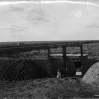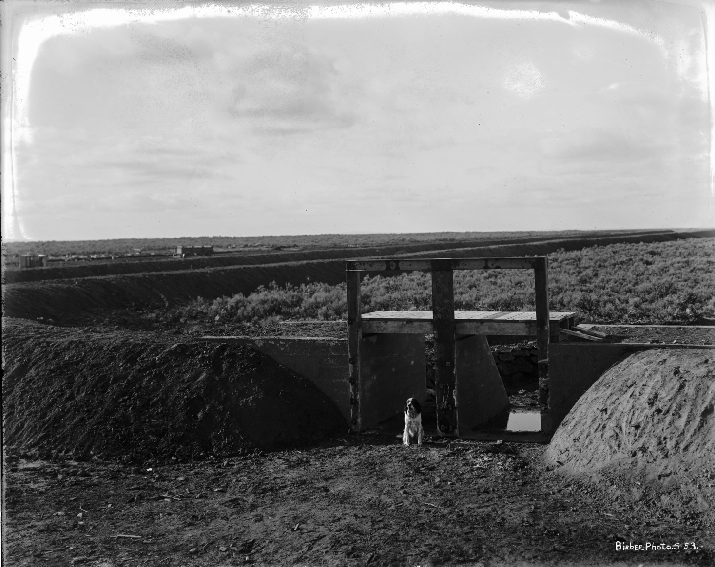 A dog stands beneath a canal gate in a dry channel. A wagon is in the background.