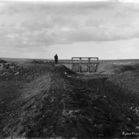 - A man stands beside the canal gates on the berm of a dry canal bed.