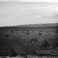 - "Wheat on the Stephen Bos Farm. First year under cultivation. Two miles north of Amsterdam, Idaho;" sheaves of wheat do the fields; foothills in background.
