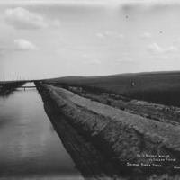 - "From Silvery Water to Golden Grain. Salmon River Tract;" view down a canal and berm surrounded by fields. A man stands in the field on the right.
