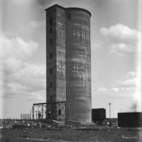 - "Hollister Elevator; Height: 105 ft; Diameter: 34 ft. inside; Capacity: 70,000 bu;" grain elevator near railroad; two men stand near entrance.