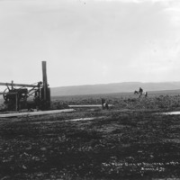 - "The Town Site of Hollister in 1907; well drilling equipment in a sagebrush plain. A man on horseback looks on from the center of the photograph.